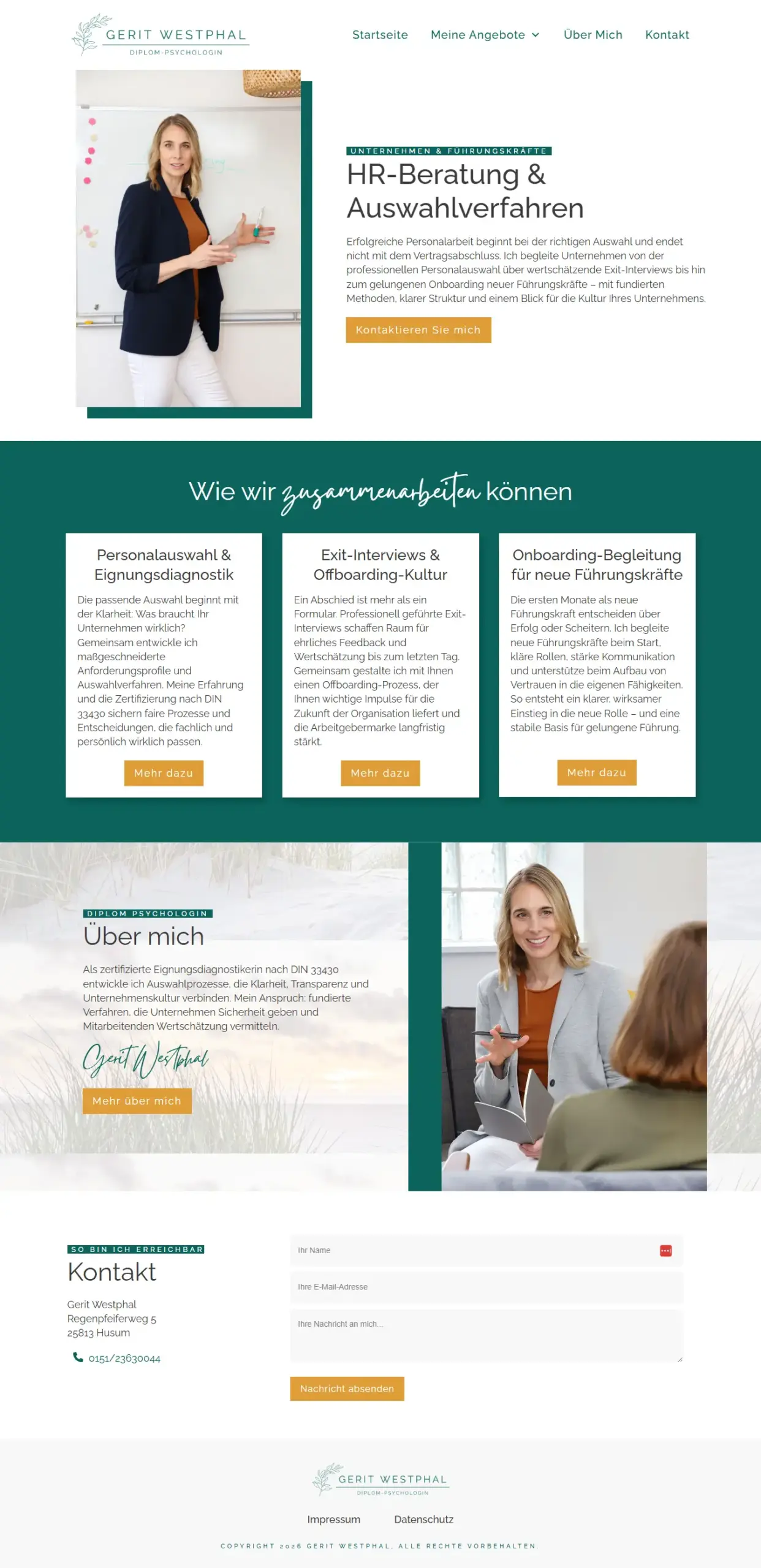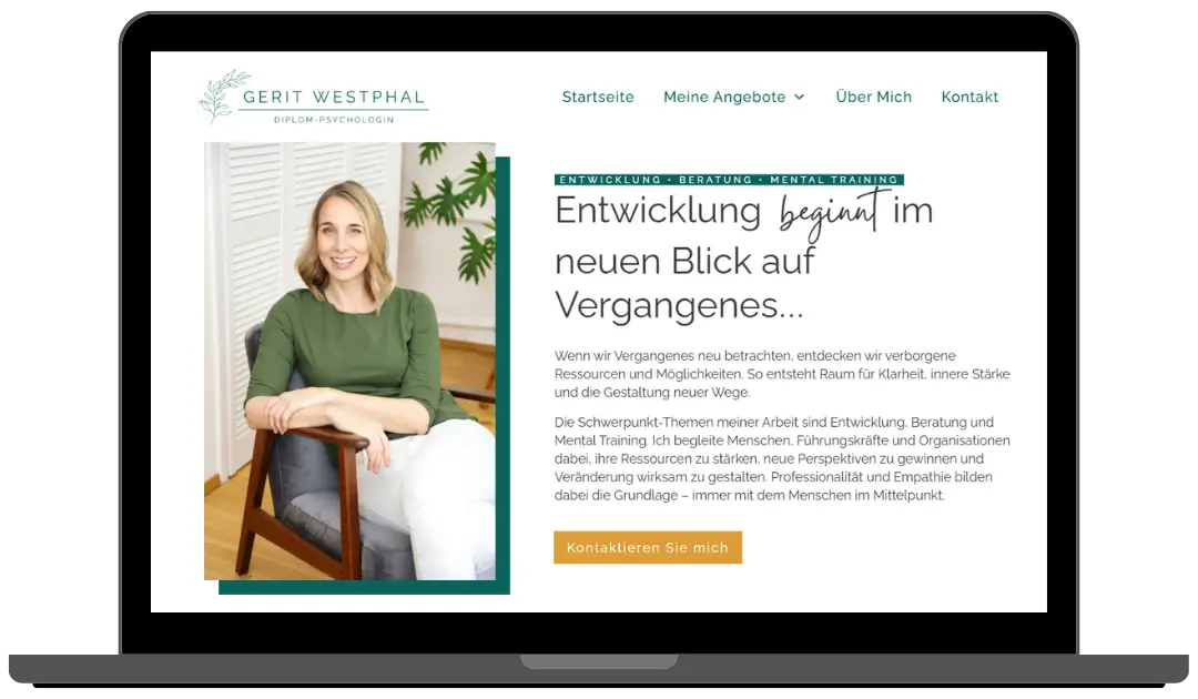 Die Website umfasst eine Startseite, eine Über mich-Seite sowie neun Angebotsunterseiten. Ziel war es, die Inhalte so zu strukturieren, dass Besucher:innen sich schnell zurechtfinden und direkt erkennen, welches Angebot zu ihrer aktuellen Situation passt.